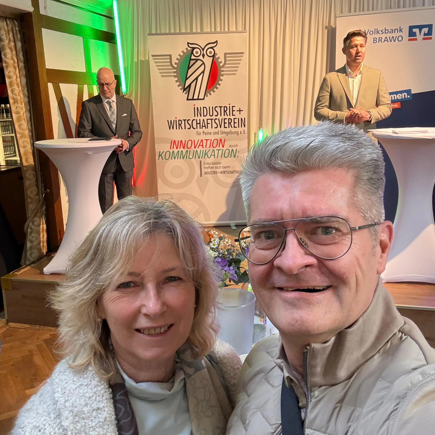 Hier Claudia Kayser Vorstandsvorsitzende der Wirtschaftsvereinigung Wolfsburg e.V. Wolfsburg e.V. mit unserem Vorstand Lutz Kadereit bei der Begrüßungsansprache von Phillip Benckendorf und Stefan Honrath , in der beide erklärten, dass Vereine in Deutschland einen ähnlich positiven Effekt auf Wohlbefinden und langes Leben bei Menschen haben, wie die „Moai“ auf Okinawa, wo die Menschen besonders alt werden.